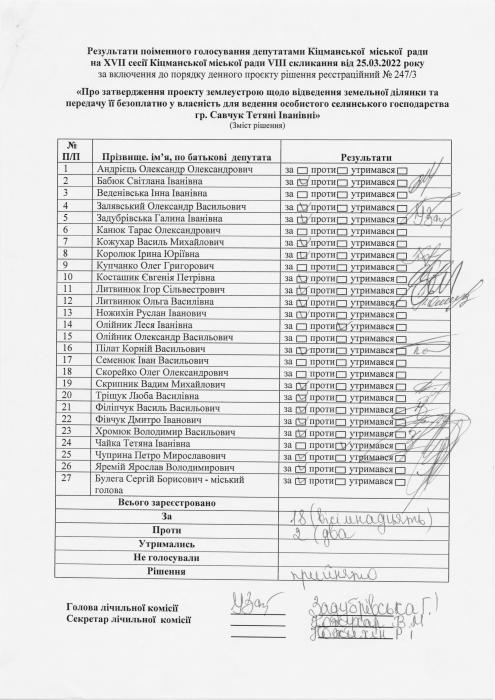 XV²² ñåñ³ÿ ʳöìàíñüêî¿ ì³ñüêî¿ ðàäè VIII ñêëèêàííÿ â³ä 25.03.2022 ðîêó > Ðåçóëüòàòè ïî³ìåííîãî ãîëîñóâàííÿ äåïóòàòàìè ʳöìàíñüêî¿ ì³ñüêî¿ ðàäè íà XV²² ñåñ³¿ ʳöìàíñüêî¿ ì³ñüêî¿ ðàäè VIII ñêëèêàííÿ â³ä 25.03.2022 ðîêó