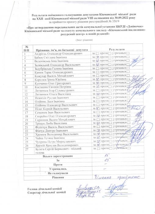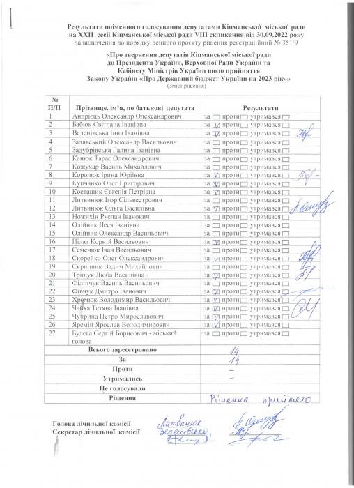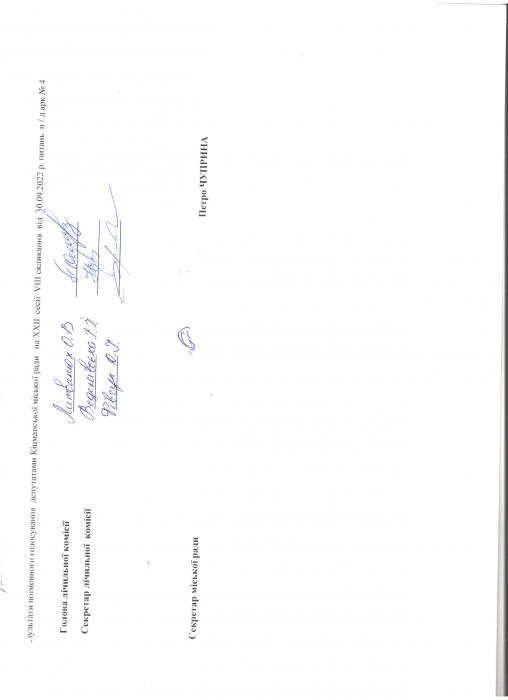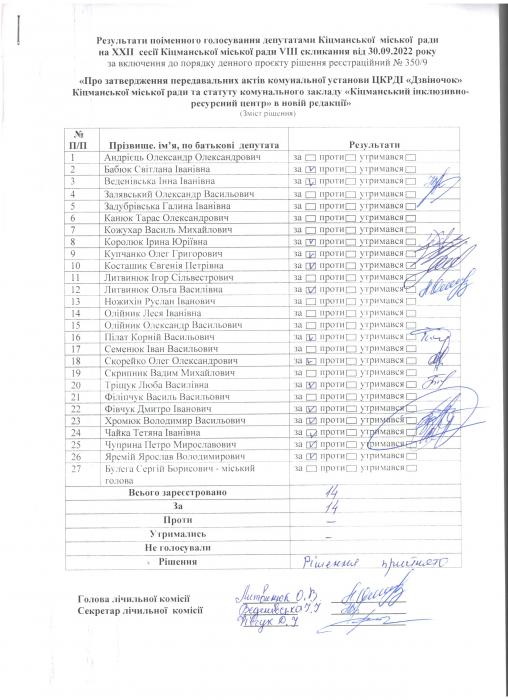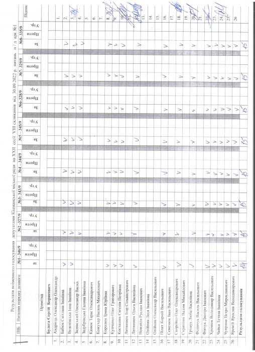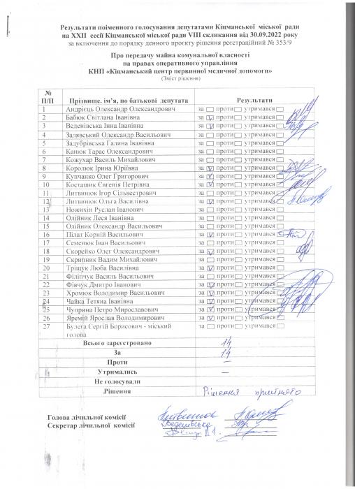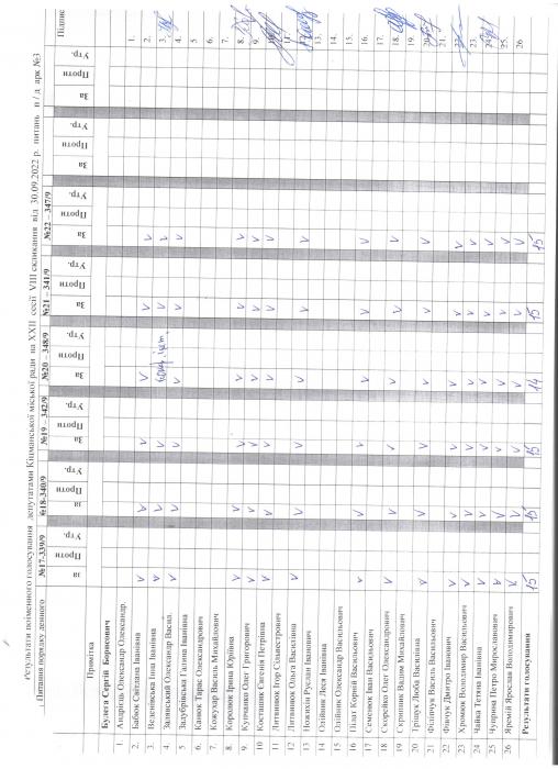 Ðåçóëüòàòè ïî³ìåííîãî ãîëîñóâàíÿ íà XXII ñåñ³¿ ʳöìàíñüêî¿ ì³ñüêî¿ ðàäè VIII ñêëèêàííÿ â³ä 30.09.2022 ðîêó