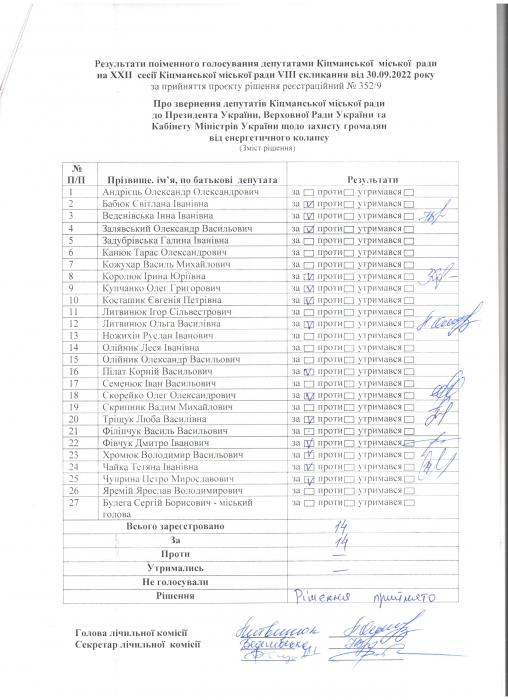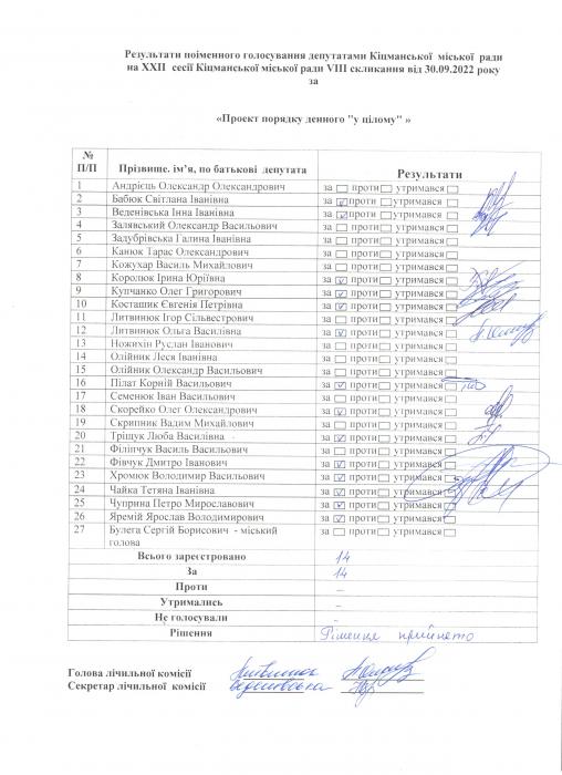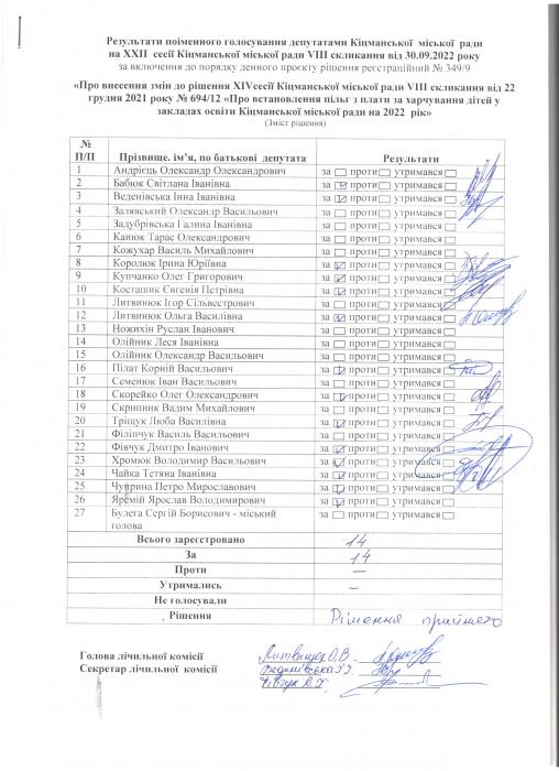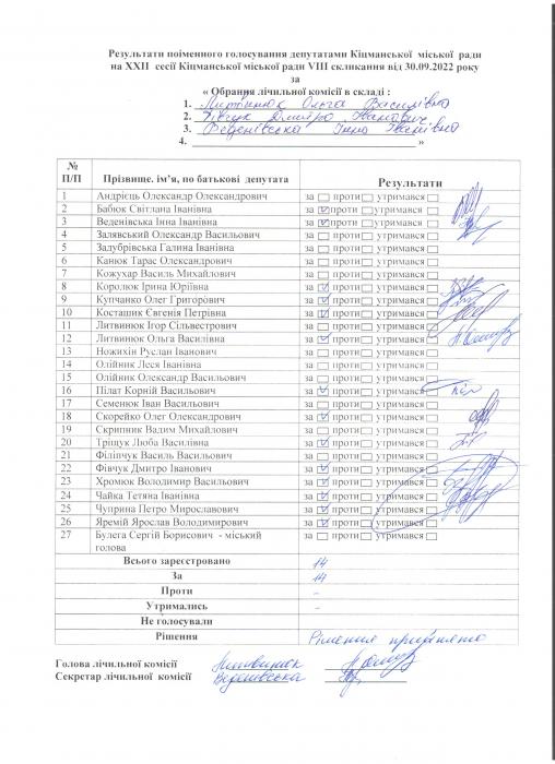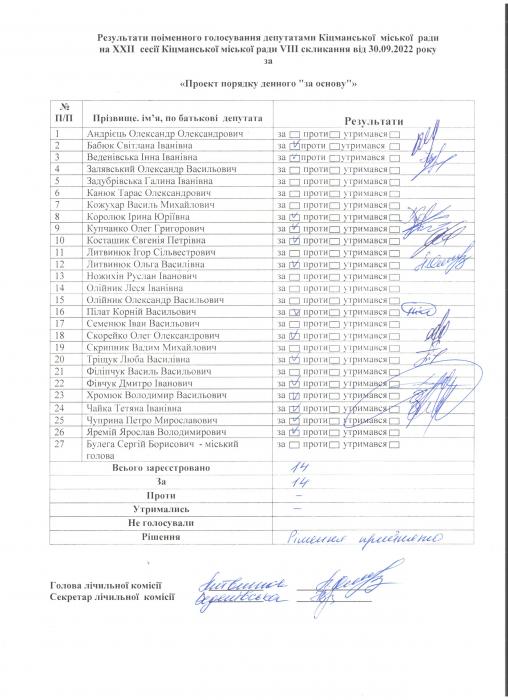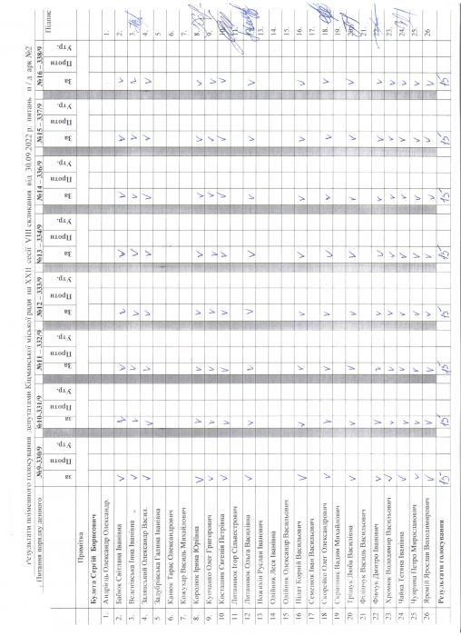 XXII ñåñ³ÿ ʳöìàíñüêî¿ ì³ñüêî¿ ðàäè VIII ñêëèêàííÿ â³ä 30.09.2022 ðîêó > Ðåçóëüòàòè ïî³ìåííîãî ãîëîñóâàíÿ íà XXII ñåñ³¿ ʳöìàíñüêî¿ ì³ñüêî¿ ðàäè VIII ñêëèêàííÿ â³ä 30.09.2022 ðîêó