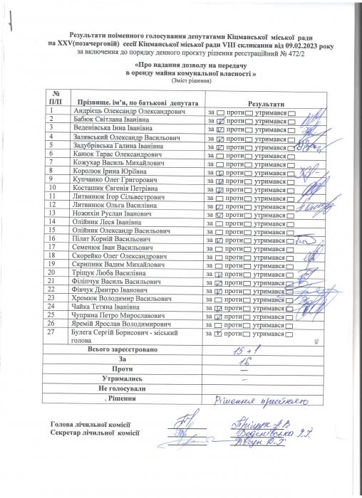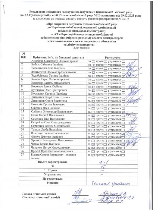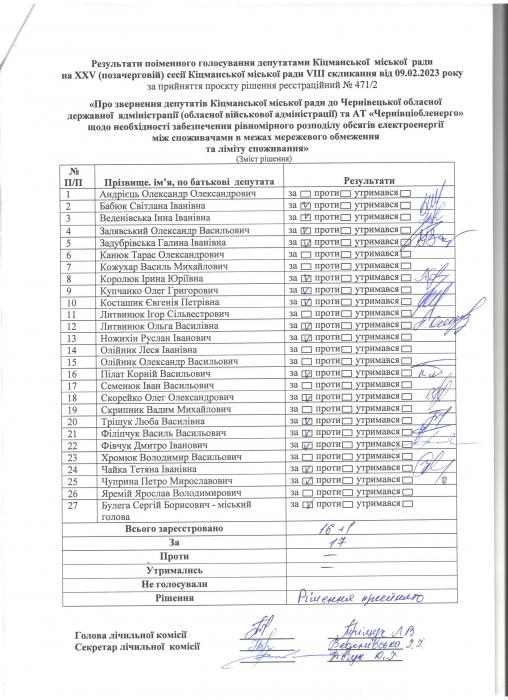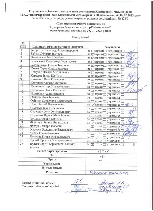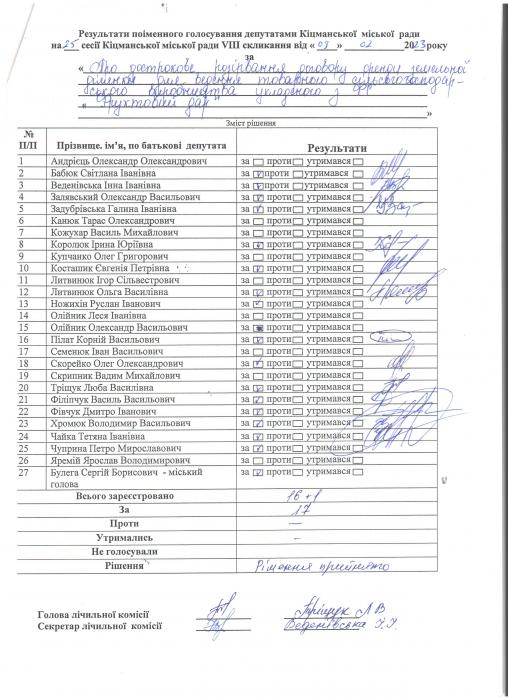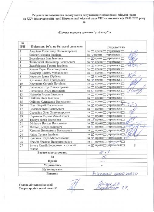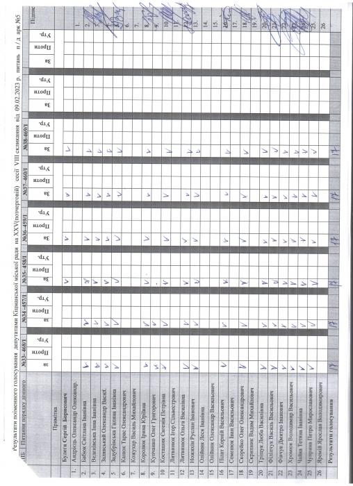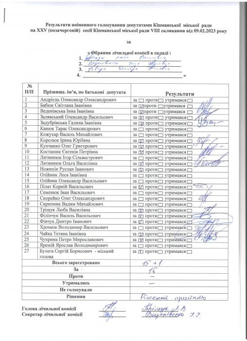 Ðåçóëüòàòè ïî³ìåííîãî ãîëîñóâàííÿ íà XXV (ïîçà÷åðãîâ³é) ñåñ³¿ ʳöìàíñüêî¿ ì³ñüêî¿ ðàäè VIII ñêëèêàííÿ â³ä 09.02.2023 ðîêó