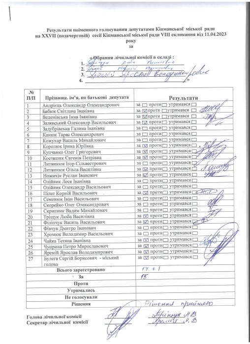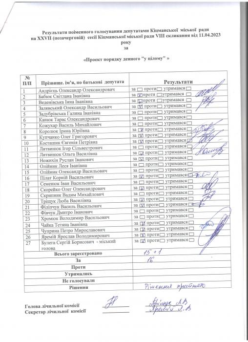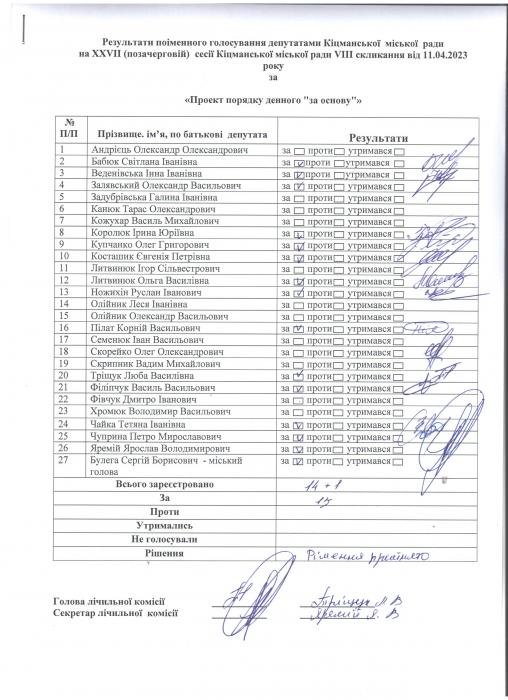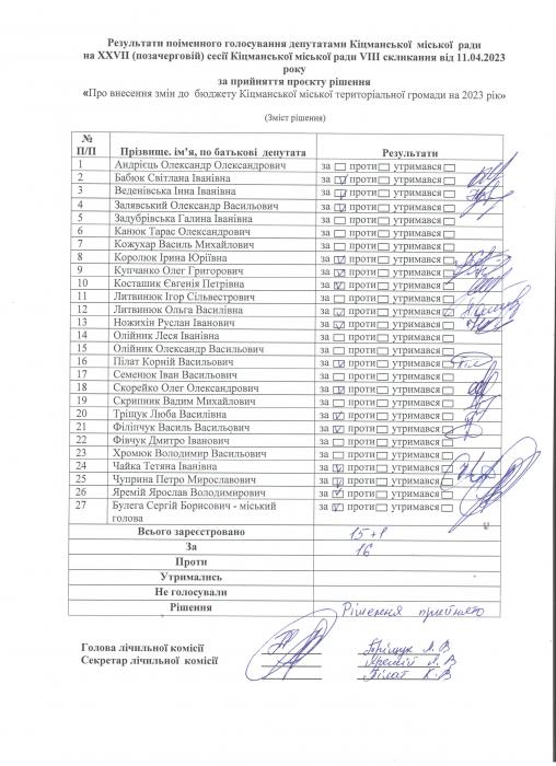Ðåçóëüòàòè ïî³ìåííîãî ãîëîñóâàííÿ íà XXVII (ïçà÷åðãîâ³é)ñåñ³¿ ʳöìàíñüêî¿ ì³ñüêî¿ ðàäè VIII ñêëèêàííÿ â³ä 11.04.2023 ðîêó