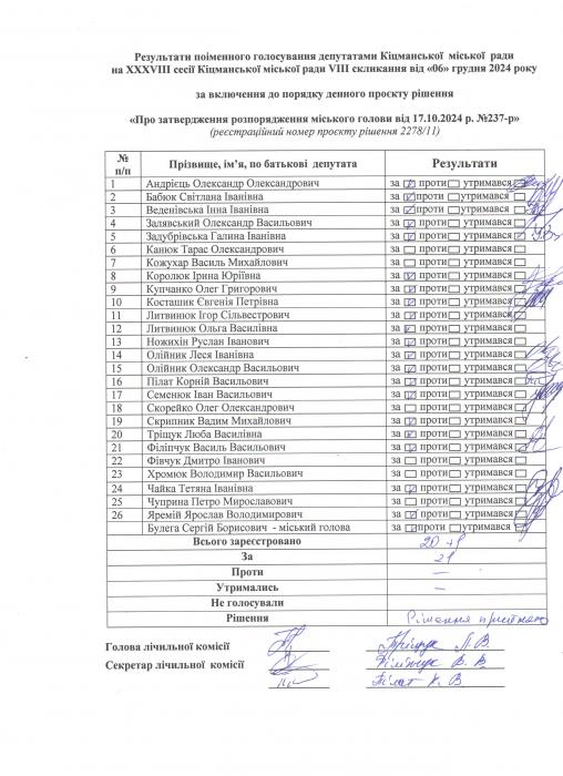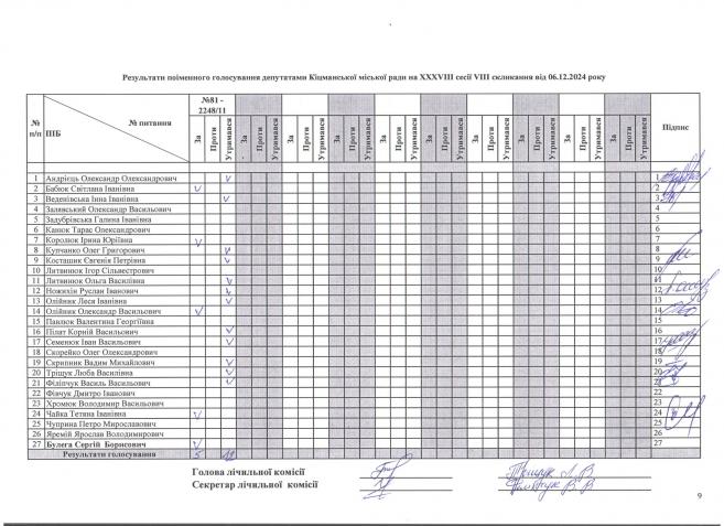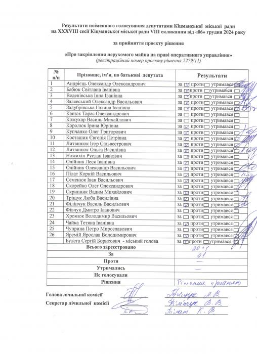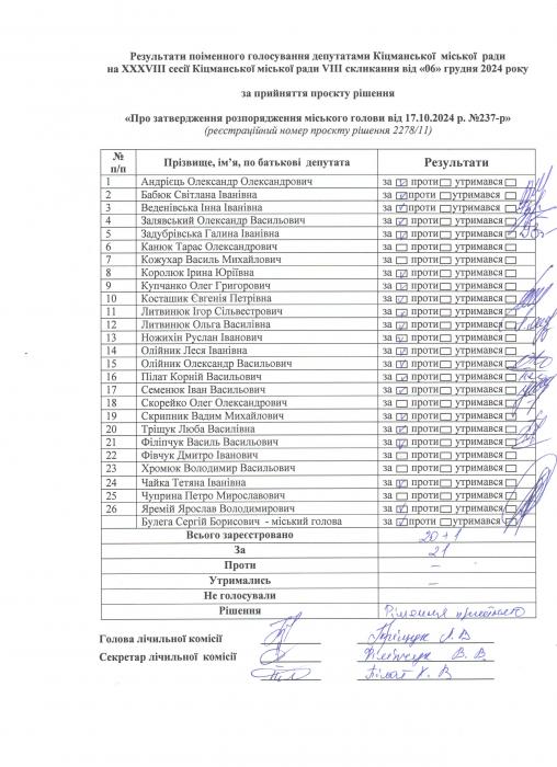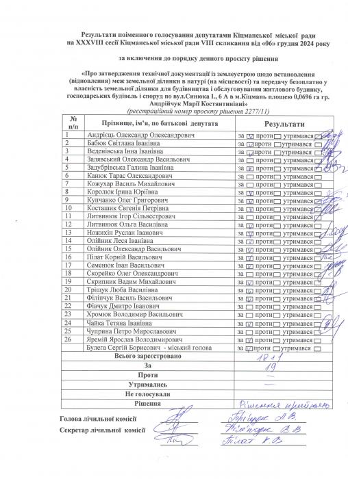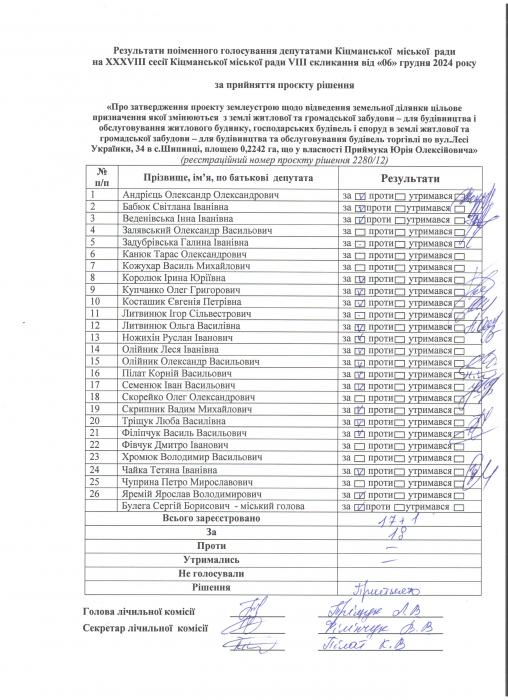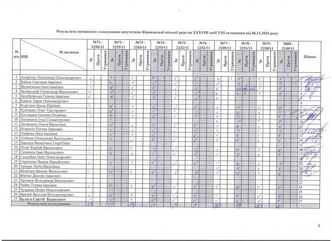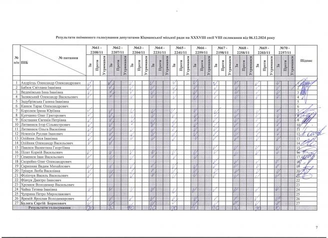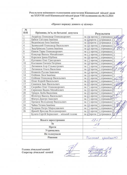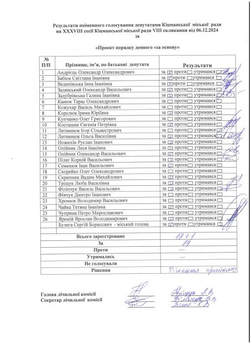 Ðåçóëüòàòè ïî³ìåííîãî ãîëîñóâàííÿ íà XXXV²²² ñåñ³¿ ʳöìàíñüêî¿ ì³ñüêî¿ ðàäè VIII ñêëèêàííÿ â³ä 06.12.2024 ðîêó