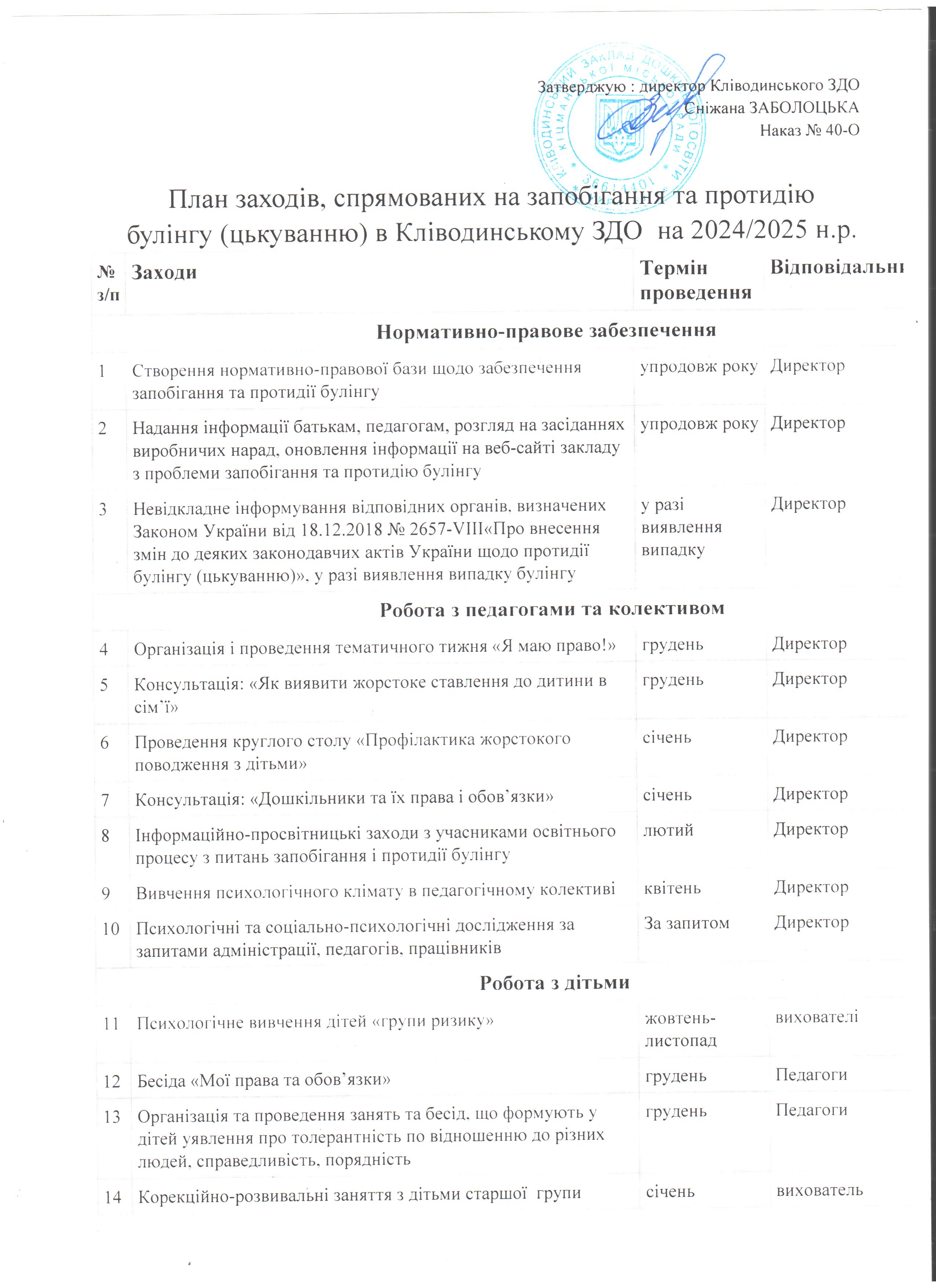 Кліводинський ЗДО > План заходів, спрямованих на протидію булінгу на 2024-2025 н.р.
