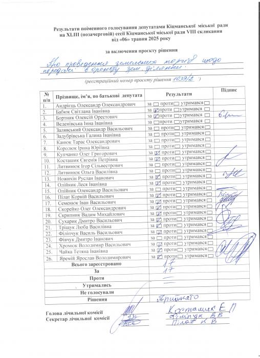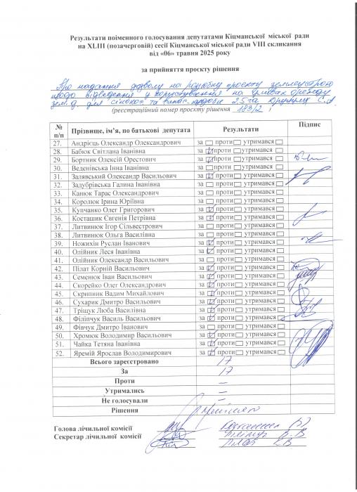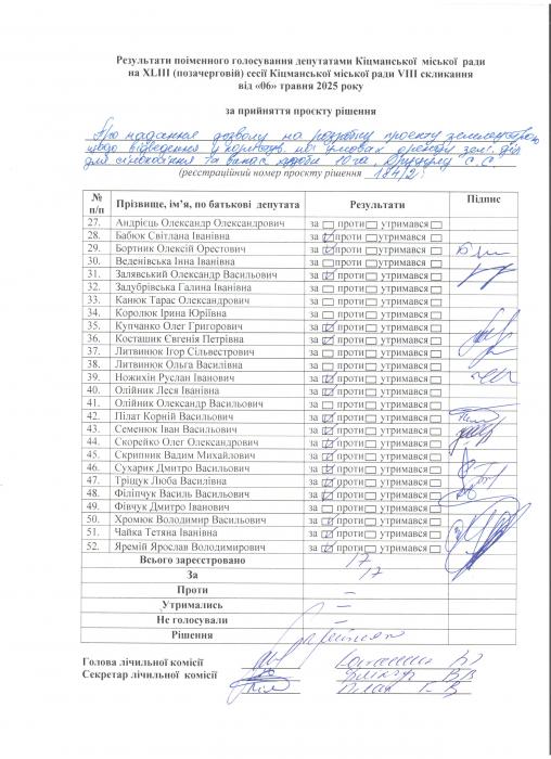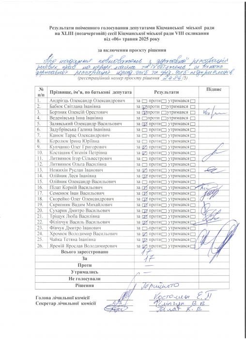 Ðåçóëüòàòè ïî³ìåííîãî ãîëîñóâàííÿ íà XL²II (ïîçà÷åðãîâ³é) ñåñ³¿ ʳöìàíñüêî¿ ì³ñüêî¿ ðàäè VIII ñêëèêàííÿ â³ä 06.05.2025 ðîêó