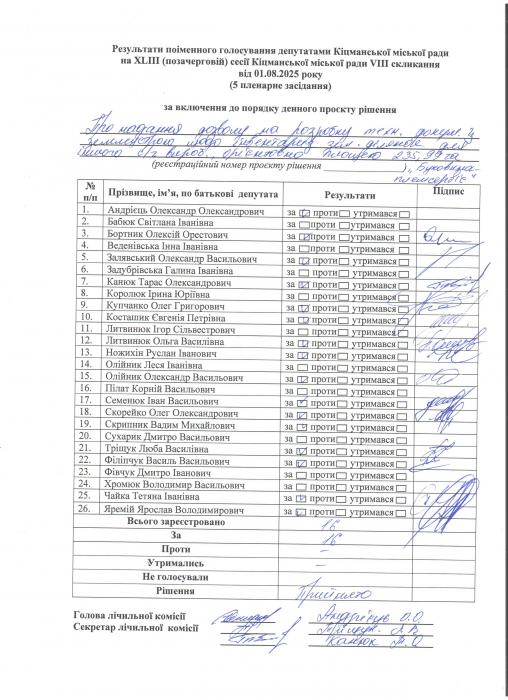 Ðåçóëüòàòè ïî³ìåííîãî ãîëîñóâàííÿ íà XL²II (ïîçà÷åðãîâ³é) ñåñ³¿ ʳöìàíñüêî¿ ì³ñüêî¿ ðàäè VIII ñêëèêàííÿ â³ä 01.08.2025 ðîêó( ï'ÿòå ïëåíàðíå çàñ³äàííÿ).