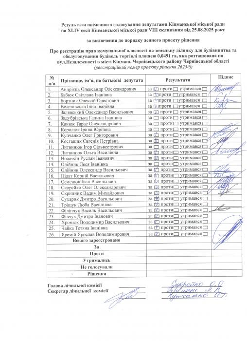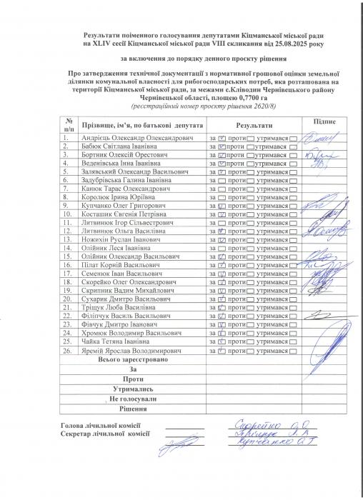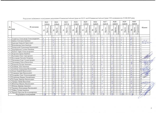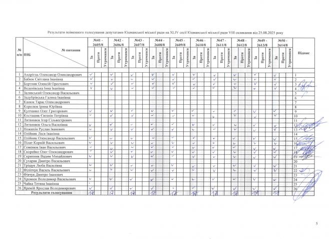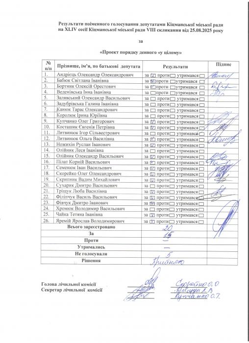 XLIV ñåñ³ÿ ʳöìàíñüêî¿ ì³ñüêî¿ ðàäè VIII ñêëèêàííÿ â³ä 25.08.2025 ðîêó. > Ðåçóëüòàòè ïî³ìåííîãî ãîëîñóâàííÿ íà XL²V ñåñ³¿ ʳöìàíñüêî¿ ì³ñüêî¿ ðàäè VIII ñêëèêàííÿ â³ä 25.08.2025 ðîêó.