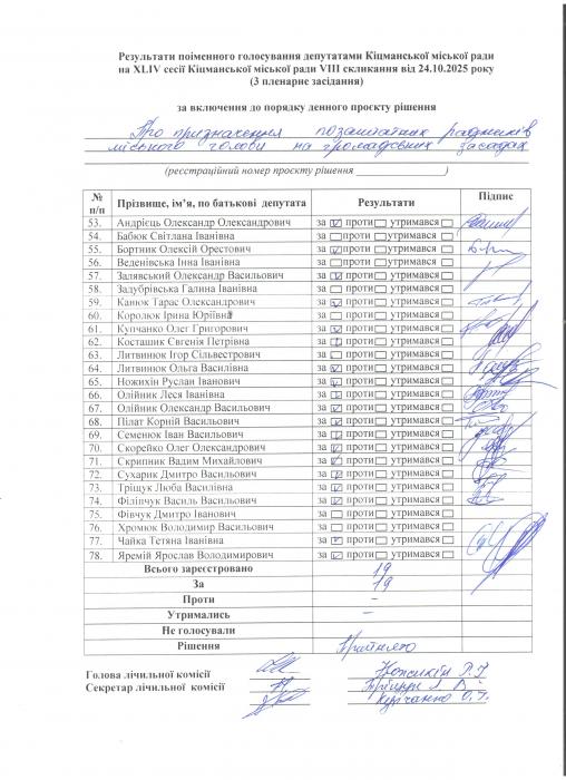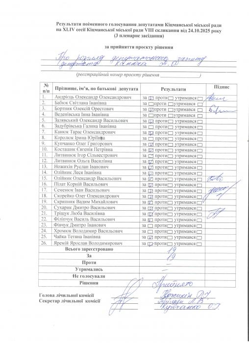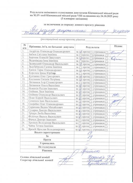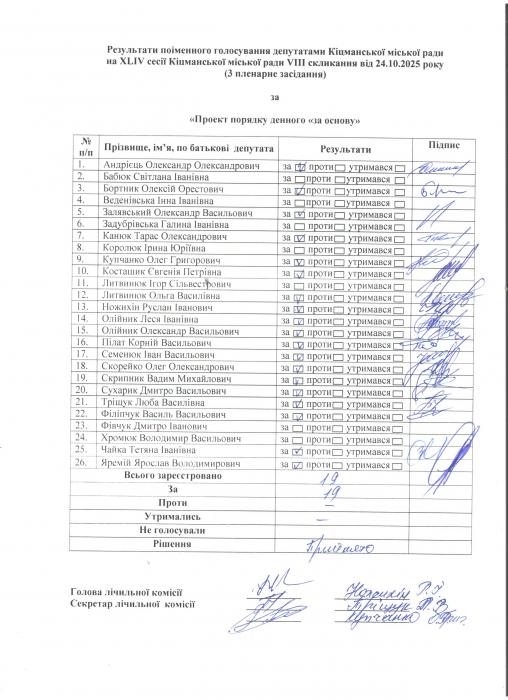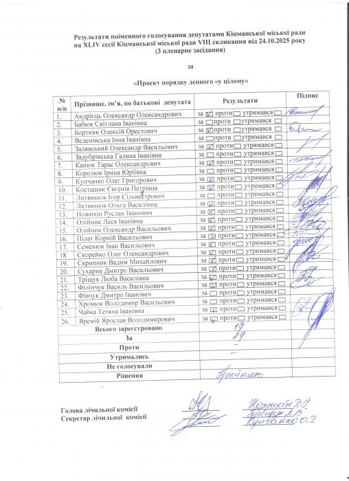 XLIV ñåñ³ÿ ʳöìàíñüêî¿ ì³ñüêî¿ ðàäè VIII ñêëèêàííÿ â³ä 24.10.2025 ðîêó (òðåòº ïëåíàðíå çàñ³äàííÿ). > Ðåçóëüòàòè ïî³ìåííîãî ãîëîñóâàííÿ íà XL²V ñåñ³¿ ʳöìàíñüêî¿ ì³ñüêî¿ ðàäè VIII ñêëèêàííÿ â³ä 24.10.2025 ðîêó ( òðåòº ïëåíàðíå çàñ³äàííÿ).