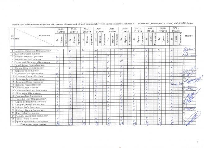 Ðåçóëüòàòè ïî³ìåííîãî ãîëîñóâàííÿ íà XL²V ñåñ³¿ ʳöìàíñüêî¿ ì³ñüêî¿ ðàäè VIII ñêëèêàííÿ â³ä 24.10.2025 ðîêó ( òðåòº ïëåíàðíå çàñ³äàííÿ).