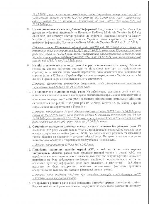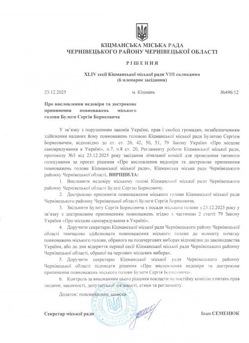 XLIV сесія Кіцманської міської ради VIII скликання від 23.12.2025 року (6 пленарне засідання). > 496/12 Про висловлення недовіри та дострокове припинення повноважень міського голови Булеги Сергія Борисович