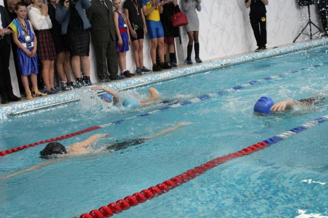 Після урочистої зустрічі та вітальних виступів стрічку оновленого басейну перерізали учні школи. А юні плавці під керівництвом спортінструктора одразу продемонстрували вміння плавати різними стилями.