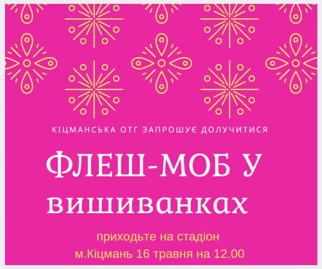 16 òðàâíÿ â ì.ʳöìàíü íà ñòàä³îí³ ³ì.Ãåðî¿â Ìàéäàíó î 12.00 â³äáóäåòüñÿ òðàäèö³éíèé äëÿ ì³ñòà ôëåø-ìîá, ÿêèé ïîëÿãຠó òîìó, ùî ëþäè, âäÿãíåí³ â óêðà¿íñüêèé íàö³îíàëüíèé îäÿã, óòâîðþþòü ÿêóñü ñèìâîë³÷íó ô³ãóðó ³ çà ê³ëüêà õâèëèí ðîçõîäÿòüñÿ. Öå îá’ºäíóº ãðîìàäñüê³ñòü ó çáåðåæåíí³ íàö³îíàëüíèõ òðàäèö³é òà ìèñòåöüêèõ íàäáàíü. Öüîãî ðîêó ó ʳöìàí³ â³äòâîðÿòü ãîëóáà ìèðó. Òîæçàïðîøóºìî äîðëó÷èòèñÿ óñ³õ áàæàþ÷èõ.