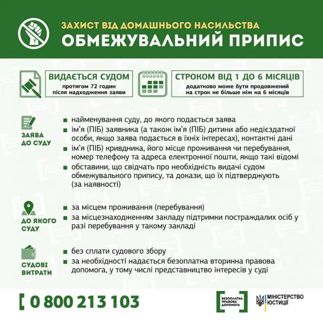 Крім того, законодавством передбачено спеціальні заходи щодо протидії домашньому насильству, одним з яких є обмежувальний припис. Закон України «Про запобігання та протидію домашньому насильству», що містить зазначену спосіб захисту, вступив у силу в січні 2018 року.