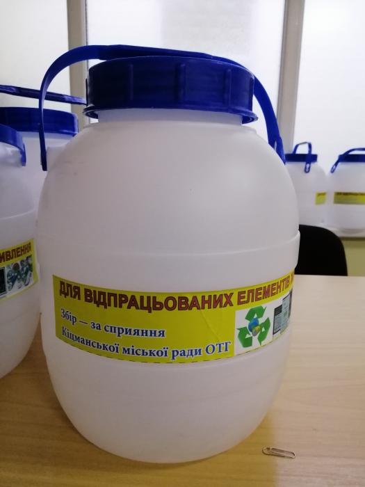 Ùîá çàïîá³ãòè ïîäàëüøîìó çàáðóäíåííþ íàâêîëèøíüîãî ñåðåäîâèùà ³ âáåðåãòè çåìëþ, íà ÿê³é ìè æèâåìî, ³ âîäó, ÿêó ï’ºìî, â³ä òÿæêèõ ìåòàë³â, ùî âèä³ëÿþòüñÿ ïðè îêèñëåííÿ òà ðóéíóâàíí³ áàòàðåéîê, ì³ñüêà ðàäà çàêóïèëà 80 êîíòåéíåð³â ì³ñòê³ñòþ 5 ë³òð³â òà 2 âåëèê³ íà 200 ë³òð³â. Ìåíø³ âæå íàéáëèæ÷èìè äíÿìè áóäóòü ðîçäàí³ ó øêîëè, ï³äïðèºìñòâà òà óñòàíîâè ʳöìàíñüêî¿ ãðîìàäè, ó ìåäè÷í³ çàêëàäè òà â ì³ñöÿ, ÿê³ ÷àñòî â³äâ³äóþòü ãðîìàäÿíè. Ïîò³ì áàòàðåéêè çáèðàòèìóòü ó á³ëüø³ êîíòåéíåðè ³ â³äïðàâëÿòèìóòü íà çàâîäè ç ïåðåðîáêè òà óòèë³çàö³¿. Íà æàëü,  Óêðà¿í³ òàêèõ çàâîä³â íåìàº, òîæ âèêîíàâ÷èé êîì³òåò òà äåïóòàòñüêèé êîðïóñ íàëàãîäæóâàòèìóòü êîíòàêòè òà ñï³âïðàöþ ç ïðîô³ëüíèìè çàâîäàìè â Ðóìóí³¿.
