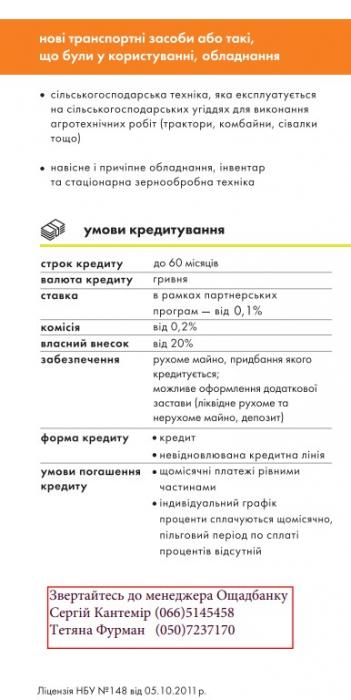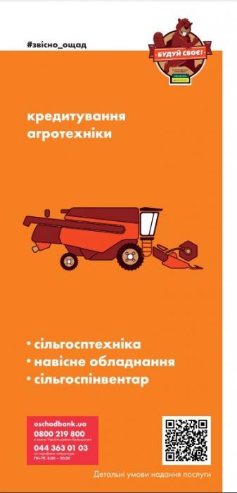 На сьогоднішній день Ощадбанк надає кредити юридичним особам та фізичним особам-підприємцям на придбання нових та б/в транспортних засобів, сільгосптехніки та обладнання, яке експлуатується на сільськогосподарських угіддях для виконання агротехнічних робіт.