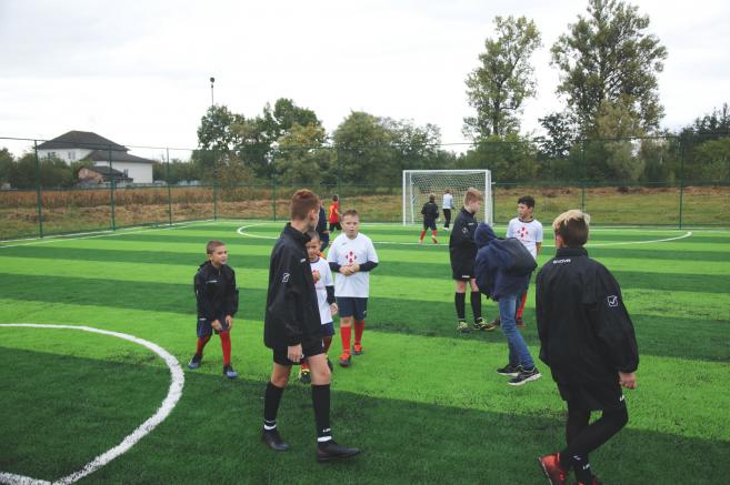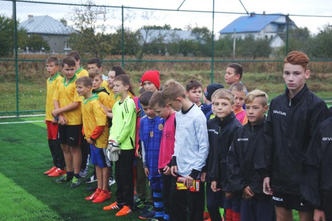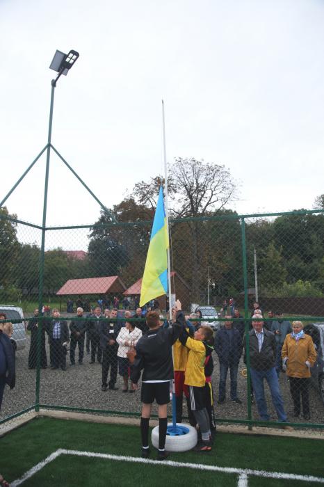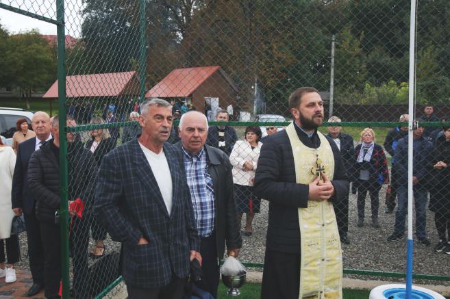 Після урочистого перерізання стрічки, новозбудований майданчик освятив місцевий священник отець Олександр, а капітани футбольних команд підняли жовто-синій державний стяг.