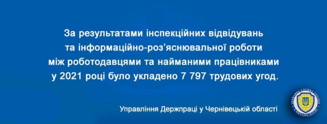 За результатами інспекційних відвідувань та інформаційно-роз’яснювальної роботи між роботодавцями та найманими працівниками у 2021 році було укладено 7 797 трудових угод.