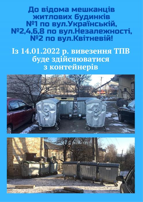 Тож із 14.01.2022 р. вивезення ТПВ буде здійснюватися з контейнерів, які розміщені:
