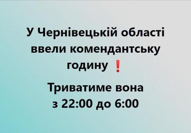 Êîìåíäàíòñüêà ãîäèíà ïî÷èíຠä³ÿòè ç 22 ãîäèíè 00 õâèëèí â ìåæàõ ×åðí³âåöüêî¿ îáëàñò³ â óñ³õ ðàéîíàõ òà íàñåëåíèõ ïóíêòàõ, òà òðèâàòèìå äî 6 ãîäèíè ðàíêó.