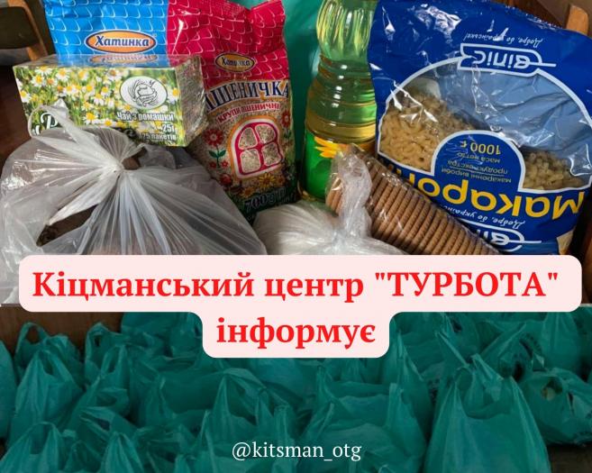 У зв'язку із тим, що гуманітарної допомоги у вигляді продуктів харчування останнім часом до нашого центру надходить все менше, Кіцманською міською радою було прийнято рішення за кошти із резервного фонду закупити харчі, щоб сформувати і вручити продуктові набори для ВПО.