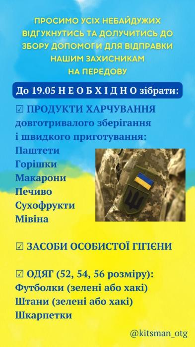 Просимо всіх небайдужих відгукнутись на прохання родичів наших захисників та долучитись до збору допомоги для відправки військовослужбовцям з нашої громади в одну з найгарячіших точок - Луганську область