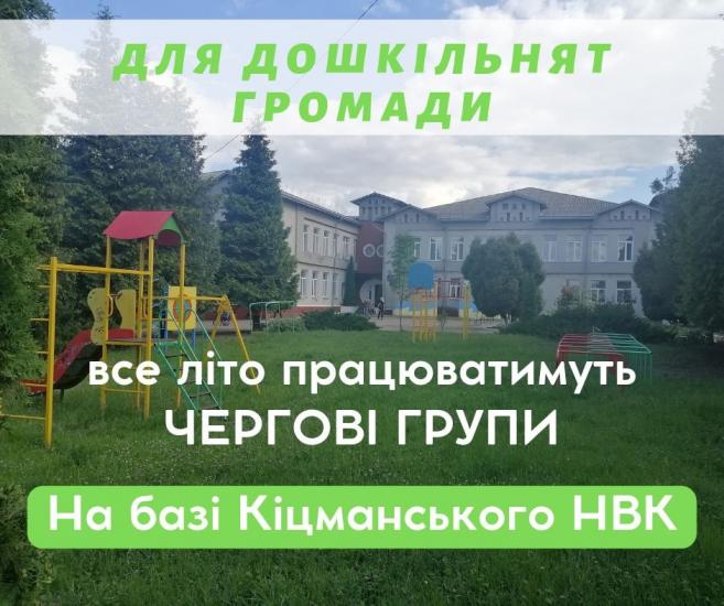 ³ää³ë îñâ³òè, ìîëîä³ òà ñïîðòó ʳöìàíñüêî¿ ì³ñüêî¿ ðàäè äîâîäèòü äî â³äîìà áàòüê³â, ùî ÷åðãîâèé äèòÿ÷èé ñàäîê ïðàöþâàòèìå âïðîäîâæ óñüîãî ë³òà, áåç êàí³êóë, íà áàç³ Ê³öìàíñüêîãî ÍÂÊ. Íàðàç³ òóò ôóíêö³îíóþòü 4 ÷åðãîâèõ ãðóïè ³ç 8-ìè ìîæëèâèõ.