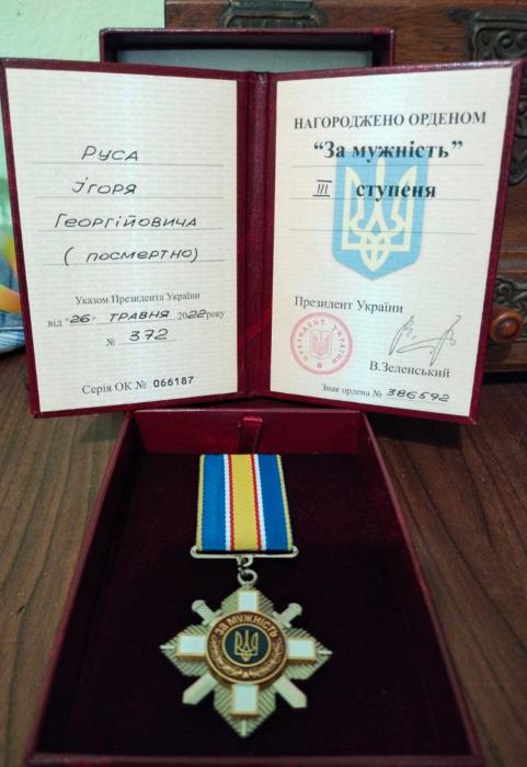 Óêàçîì Ïðåçèäåíòà Óêðà¿íè ¹ 372/2022 «Çà îñîáèñòó ìóæí³ñòü ³ ñàìîâ³ääàí³ ä³¿, âèÿâëåí³ ó çàõèñò³ äåðæàâíîãî ñóâåðåí³òåòó òà òåðèòîð³àëüíî¿ ö³ë³ñíîñò³ Óêðà¿íè, â³ðí³ñòü â³éñüêîâ³é ïðèñÿç³» äåðæàâíîþ íàãîðîäîþ â³äçíà÷èëè â³éñüêîâîñëóæáîâöÿ ²ãîðÿ Ãåîðã³éîâè÷à Ðóñà (ïîñìåðòíî).