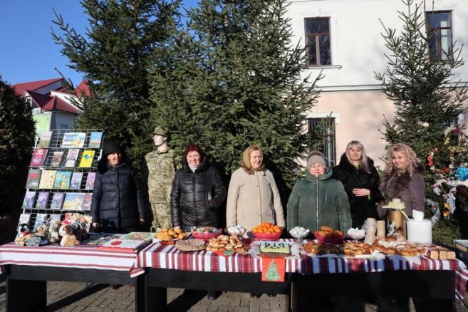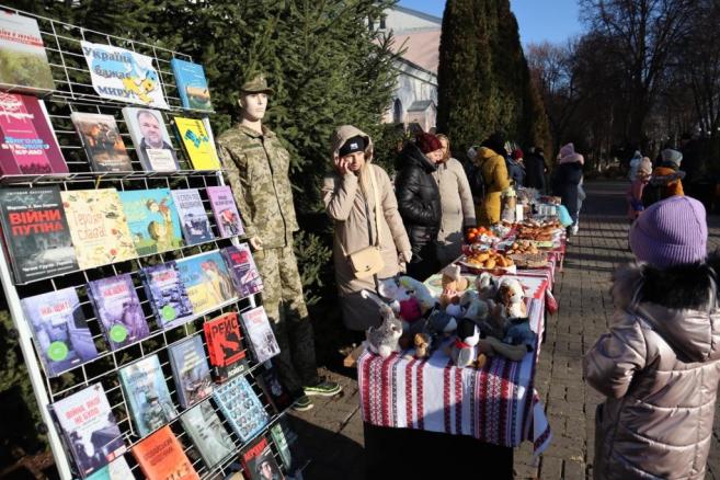 На площі також активно проходив благодійний книжковий ярмарок, до якого долучились діти катехитичної школи УГКЦ та катехит п.Надія Петруняк, клубні та бібліотечні працівники громади, підприємці, жителі міста Кіцмань Ірина Скрипник, Богдана Северин, Віктор Литвинюк, Максим Могила. Тож відвідувачі могли зробити свій внесок у Перемогу і придбати вироби ручної роботи (патріотичні сувеніри, свічечки, різдвяні віночки), домашню випічку та інші смаколики. Усі виручені кошти будуть спрямовані на потреби наших захисників.