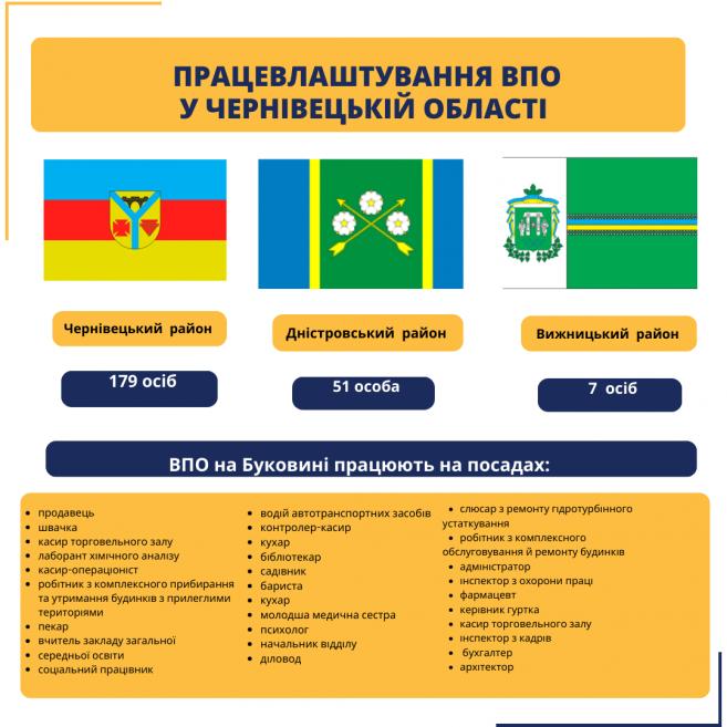 Найбільше ВПО знайшли роботу у Чернівецькому районі – 179, у Дністровському районі – 51 та у Вижницькому – 7 людей.