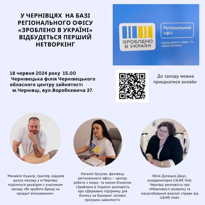 18 червня 2024 року о 15.00 год у Чернівецькій філії Чернівецького обласного центру зайнятості на базі регіонального офісу – центру роботи з мікро- та малим бізнесом «Зроблено в Україні» відбудеться перший неформальний нетворкінг.