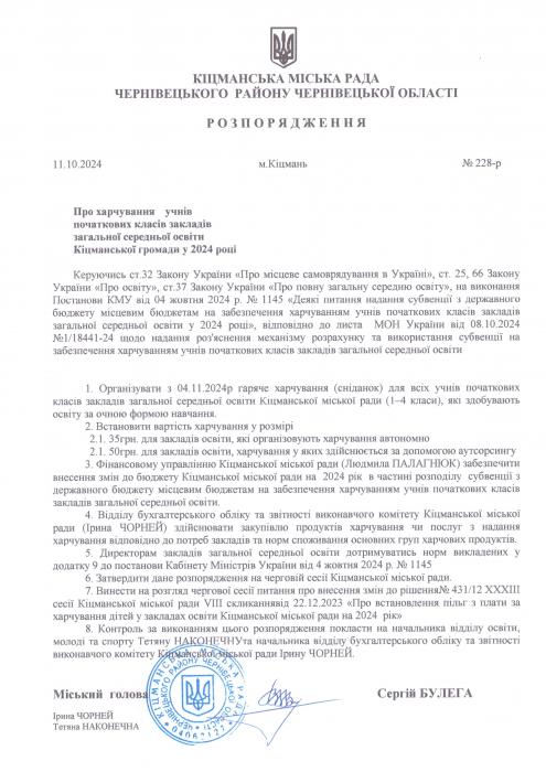 2205/11 Ïðî çàòâåðäæåííÿ ðîçïîðÿäæåííÿ ì³ñüêîãî ãîëîâè â³ä 11.10.2024 ¹228-ð «Ïðî õàð÷óâàííÿ ó÷í³â ïî÷àòêîâèõ êëàñ³â çàêëàä³â çàãàëüíî¿ ñåðåäíüî¿ îñâ³òè ʳöìàíñüêî¿ ãðîìàäè ó 2024 ðîö³»