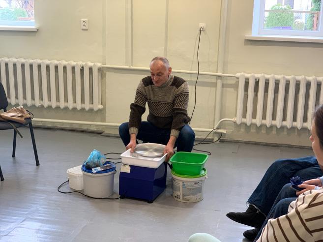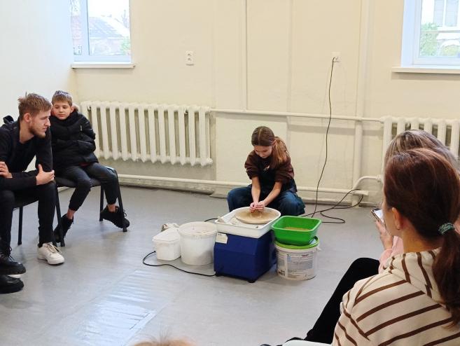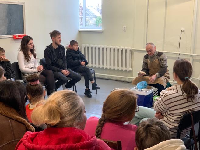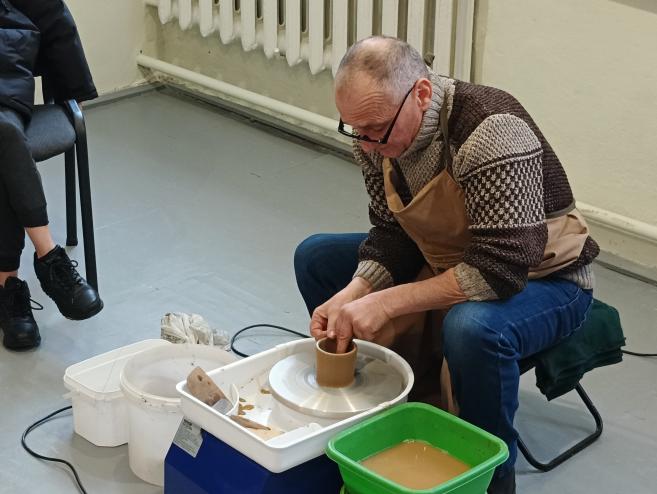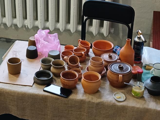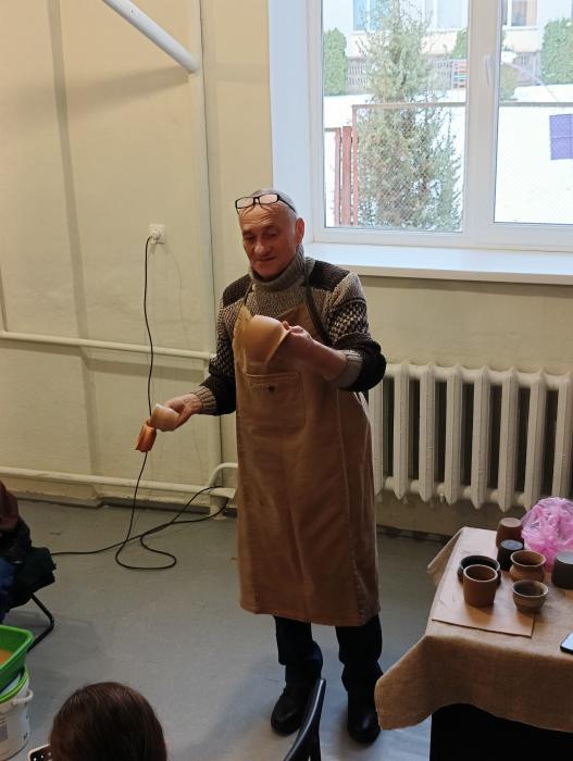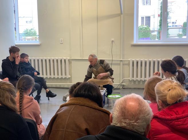 🏺Богдан Олександрович розпочав майстер-клас із загальної інформації про гончарство, гончарне коло, глину, допоміжні інструменти, показував вже випалені вироби.