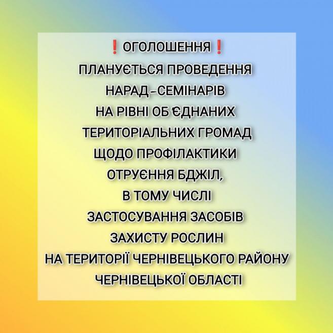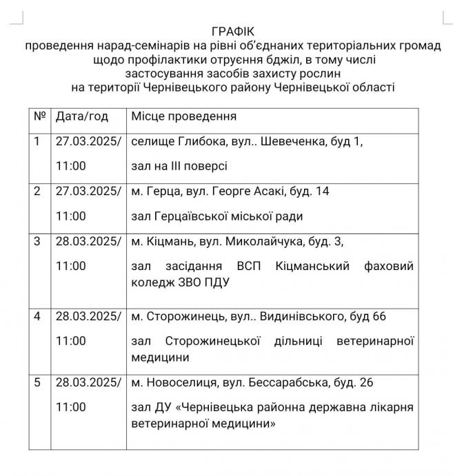 ГРАФІК проведення нарад-семінарів на рівні об’єднаних територіальних громад щодо профілактики отруєння бджіл, в тому числі застосування засобів захисту рослин на території Чернівецького району Чернівецької області