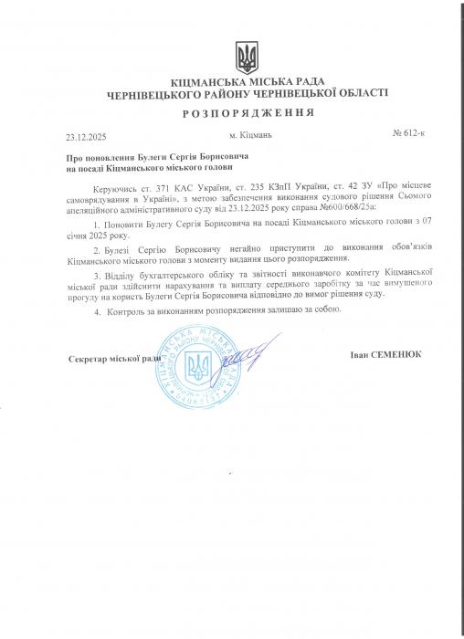 Ðîçïîðÿäæåííÿ â³ä 23.12.2025 ðîêó ¹612-ê "Ïðî ïîíîâëåííÿ Áóëåãè Ñåðã³ÿ Áîðèñîâè÷à íà ïîñàä³ Ê³öìàíñüêîãî ì³ñüêîãî ãîëîâè"