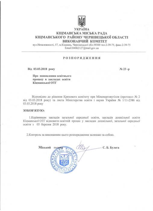 ³äïîâ³äíî äî ð³øåííÿ Êðèçîâîãî êîì³òåòó ïðè ̳íåíåðãîâóã³ëëÿ (ïðîòîêîë ¹ 2 â³ä 03.03.2018 ðîêó) òà ëèñòà ̳í³ñòåðñòâà îñâ³òè ³ íàóêè Óêðà¿íè ¹ 1/11-2386 â³ä 03.03.2018 ðîêó ðîçïîðÿäæåííÿì ì³ñüêîãî ãîëîâè ç 5 áåðåçíÿ 2018 ðîêó â³äíîâëåíî îñâ³òí³é ïðîöåñ ó çàêëàäàõ äîøê³ëüíî¿, çàãàëüíî¿ ñåðåäíüî¿ îñâ³òè ʳöìàíñüêî¿ ÎÒÃ