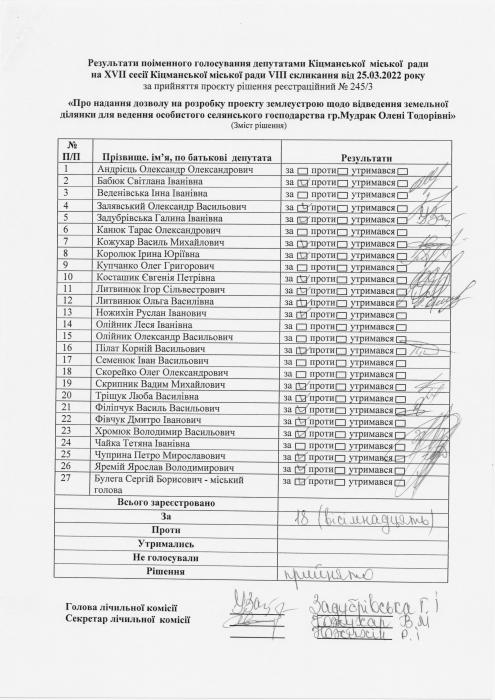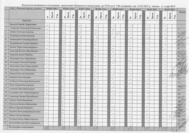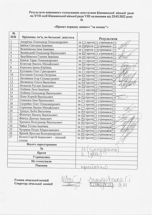 XV²² ñåñ³ÿ ʳöìàíñüêî¿ ì³ñüêî¿ ðàäè VIII ñêëèêàííÿ â³ä 25.03.2022 ðîêó > Ðåçóëüòàòè ïî³ìåííîãî ãîëîñóâàííÿ äåïóòàòàìè ʳöìàíñüêî¿ ì³ñüêî¿ ðàäè íà XV²² ñåñ³¿ ʳöìàíñüêî¿ ì³ñüêî¿ ðàäè VIII ñêëèêàííÿ â³ä 25.03.2022 ðîêó