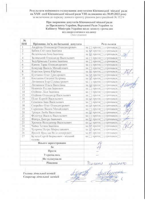 XXII ñåñ³ÿ ʳöìàíñüêî¿ ì³ñüêî¿ ðàäè VIII ñêëèêàííÿ â³ä 30.09.2022 ðîêó > Ðåçóëüòàòè ïî³ìåííîãî ãîëîñóâàíÿ íà XXII ñåñ³¿ ʳöìàíñüêî¿ ì³ñüêî¿ ðàäè VIII ñêëèêàííÿ â³ä 30.09.2022 ðîêó