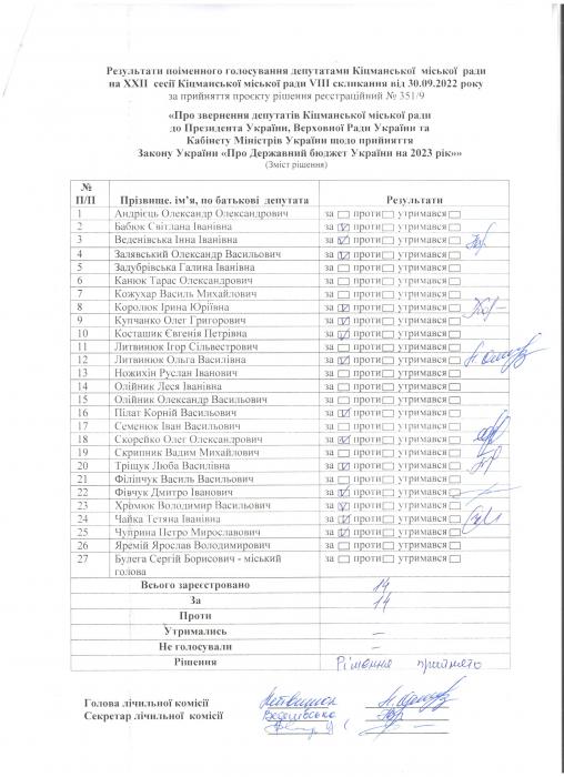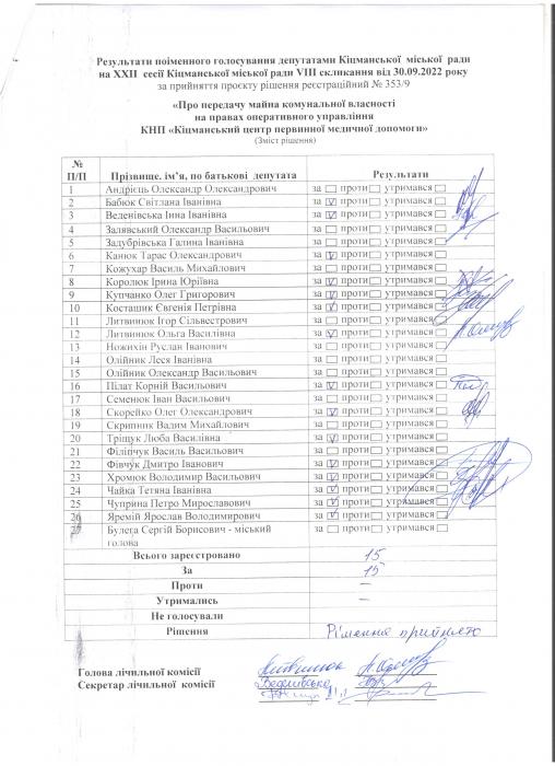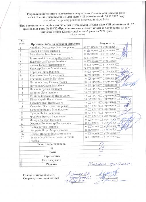 Ðåçóëüòàòè ïî³ìåííîãî ãîëîñóâàíÿ íà XXII ñåñ³¿ ʳöìàíñüêî¿ ì³ñüêî¿ ðàäè VIII ñêëèêàííÿ â³ä 30.09.2022 ðîêó