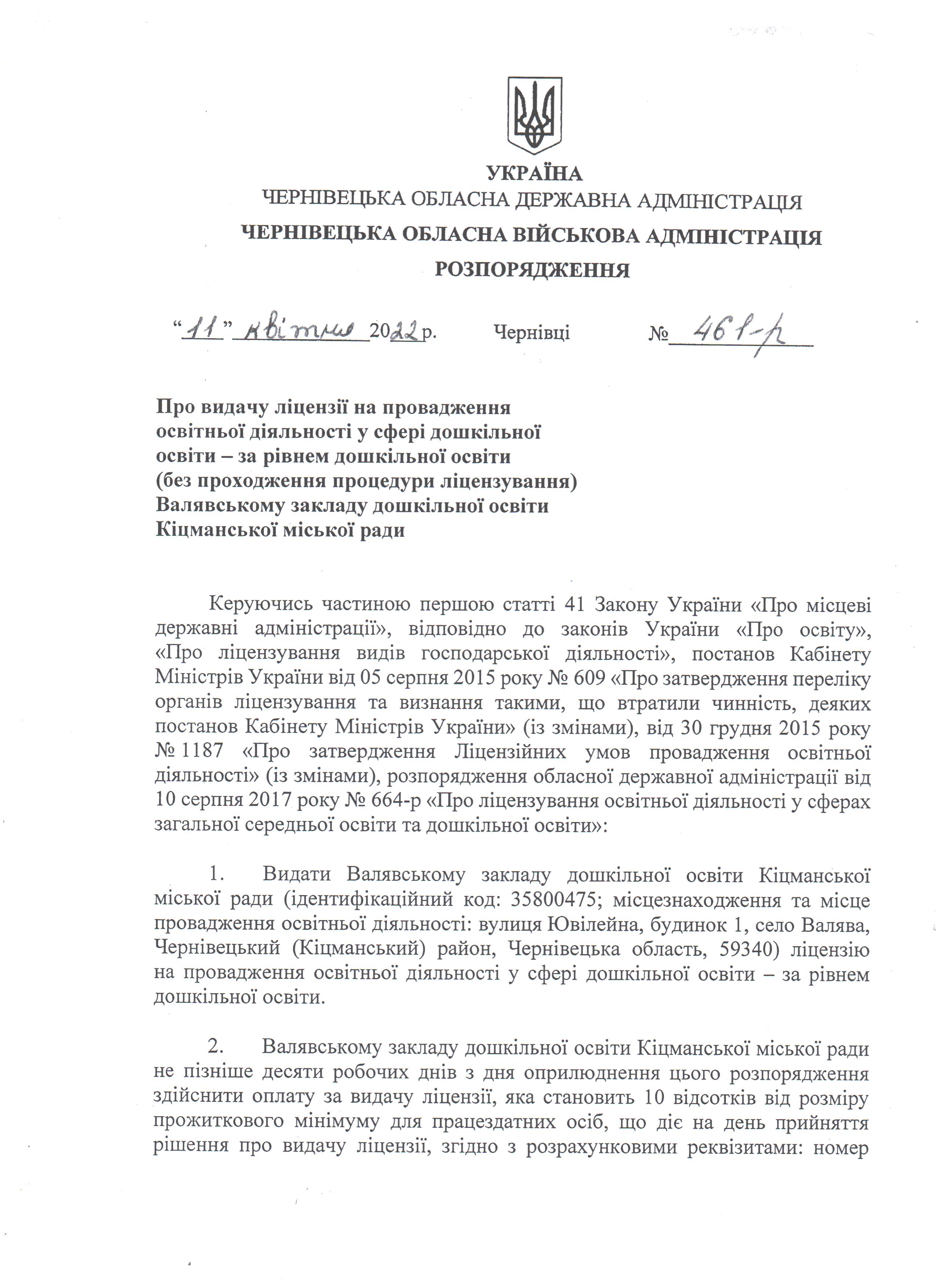 Валявський ЗДО > Розпорядження про видачу ліцензії на провадження освітньої діяльності у сфері дошкільної освіти