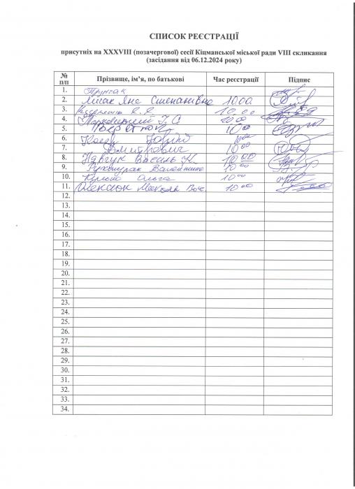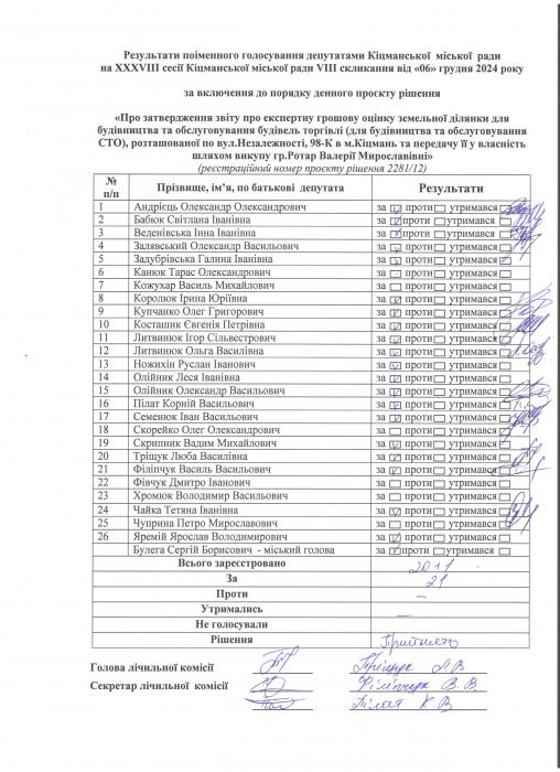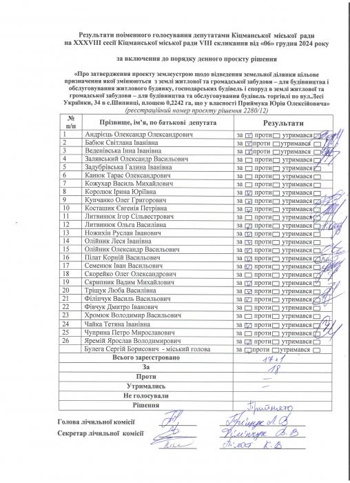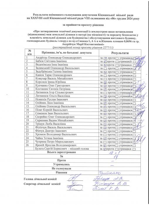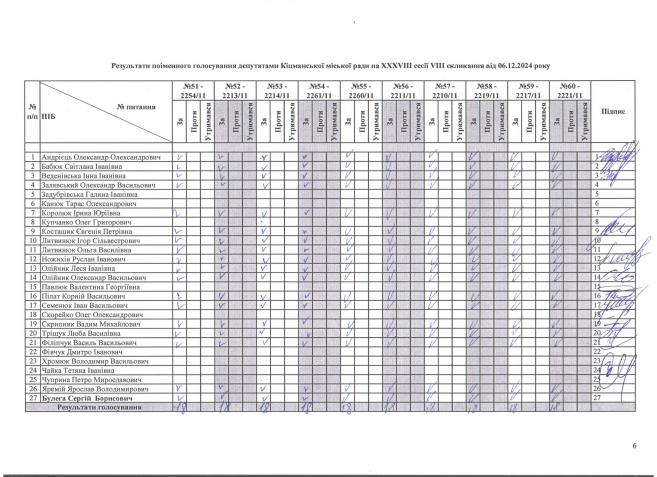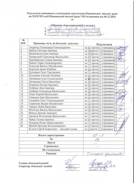 Ðåçóëüòàòè ïî³ìåííîãî ãîëîñóâàííÿ íà XXXV²²² ñåñ³¿ ʳöìàíñüêî¿ ì³ñüêî¿ ðàäè VIII ñêëèêàííÿ â³ä 06.12.2024 ðîêó