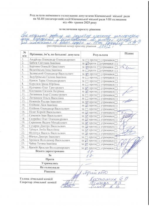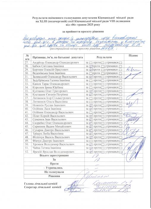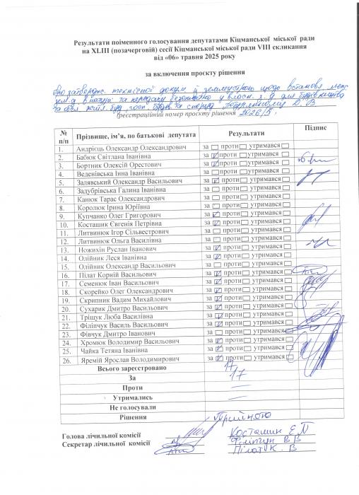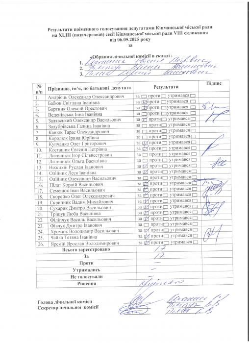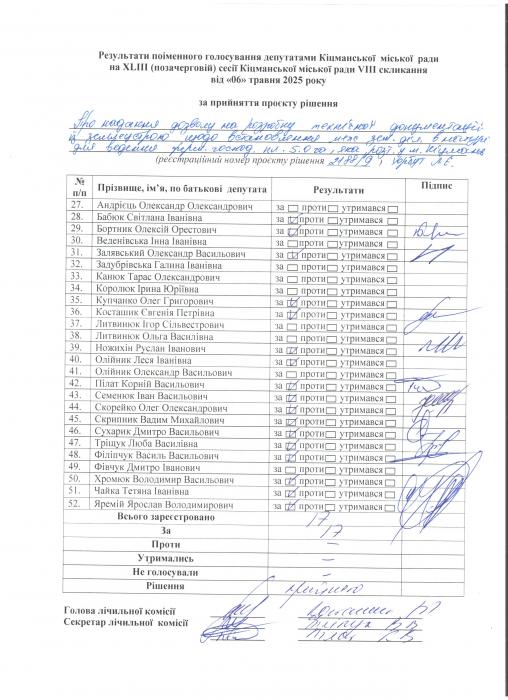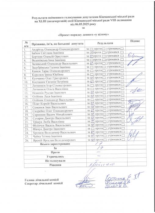 XLIII (ïîçà÷åðãîâà) ñåñ³ÿ ʳöìàíñüêî¿ ì³ñüêî¿ ðàäè VIII ñêëèêàííÿ â³ä 06.05.2025 ðîêó. > Ðåçóëüòàòè ïî³ìåííîãî ãîëîñóâàííÿ íà XL²II (ïîçà÷åðãîâ³é) ñåñ³¿ ʳöìàíñüêî¿ ì³ñüêî¿ ðàäè VIII ñêëèêàííÿ â³ä 06.05.2025 ðîêó