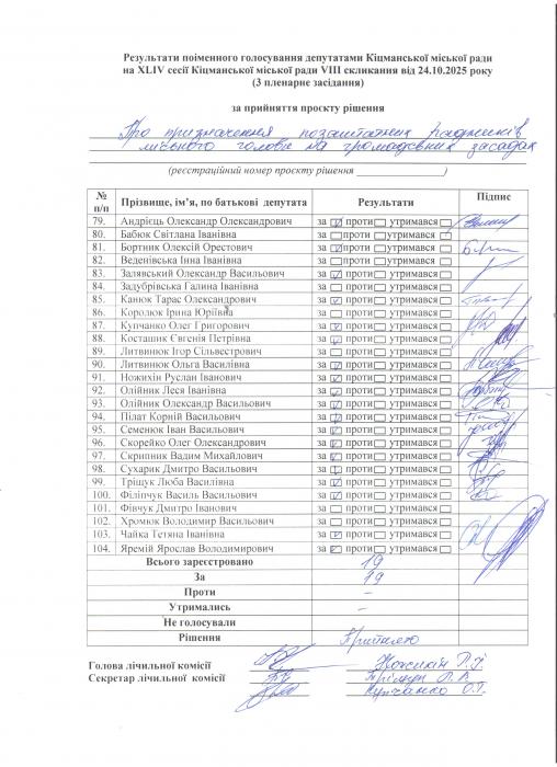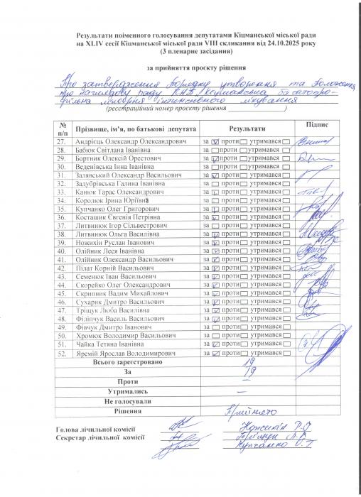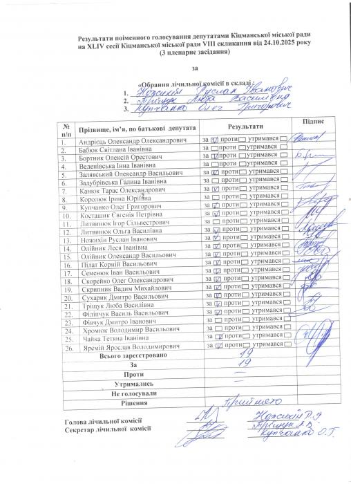 Ðåçóëüòàòè ïî³ìåííîãî ãîëîñóâàííÿ íà XL²V ñåñ³¿ ʳöìàíñüêî¿ ì³ñüêî¿ ðàäè VIII ñêëèêàííÿ â³ä 24.10.2025 ðîêó ( òðåòº ïëåíàðíå çàñ³äàííÿ).