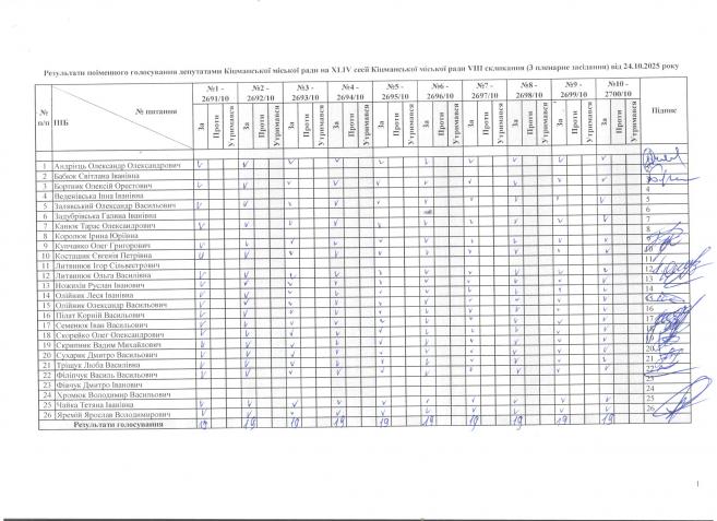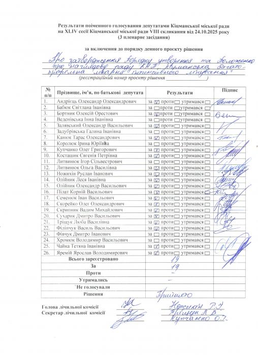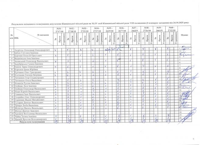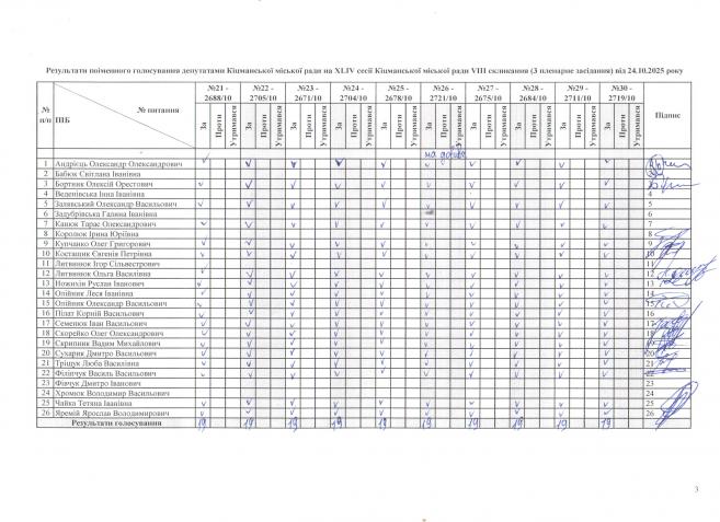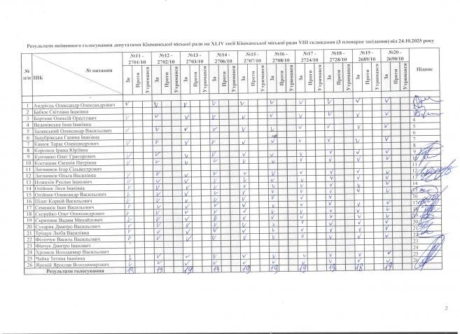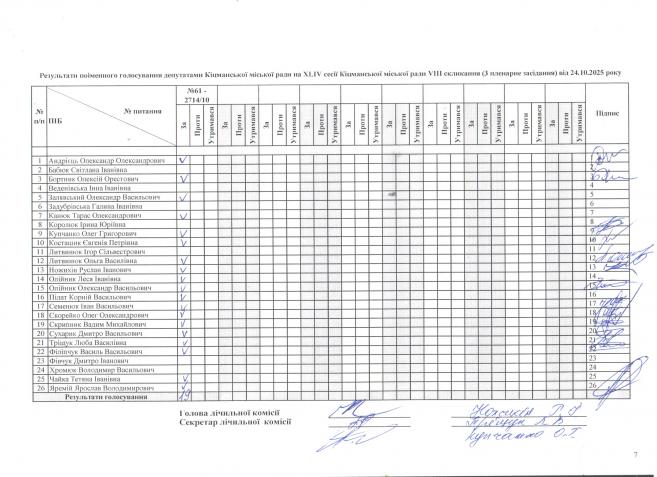 XLIV ñåñ³ÿ ʳöìàíñüêî¿ ì³ñüêî¿ ðàäè VIII ñêëèêàííÿ â³ä 24.10.2025 ðîêó (òðåòº ïëåíàðíå çàñ³äàííÿ). > Ðåçóëüòàòè ïî³ìåííîãî ãîëîñóâàííÿ íà XL²V ñåñ³¿ ʳöìàíñüêî¿ ì³ñüêî¿ ðàäè VIII ñêëèêàííÿ â³ä 24.10.2025 ðîêó ( òðåòº ïëåíàðíå çàñ³äàííÿ).