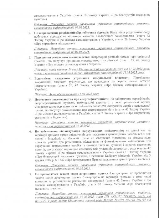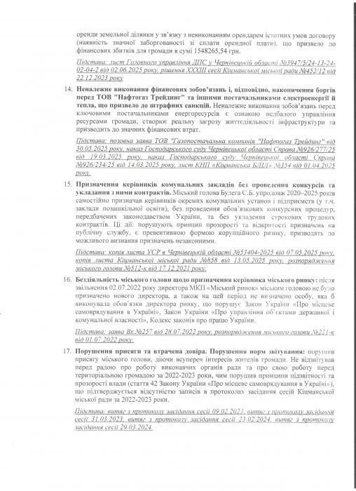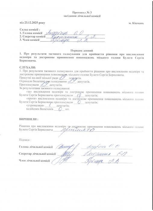 XLIV сесія Кіцманської міської ради VIII скликання від 23.12.2025 року (6 пленарне засідання). > 496/12 Про висловлення недовіри та дострокове припинення повноважень міського голови Булеги Сергія Борисович
