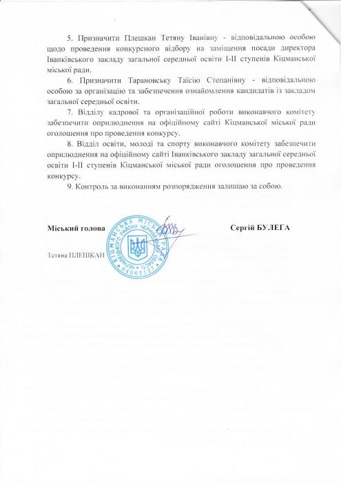 Про відтермінування проведення конкурсу на заміщення посади директора Іванківського ЗЗСО I-II ступенів Кіцманської міської ради