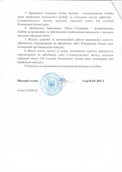 Про відтермінування проведення конкурсу на заміщення посади директора Суховерхівського ЗЗСО I-II ступенів Кіцманської міської ради