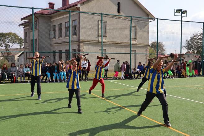 Ñïðàâæíº çàõîïëèâå ä³éñòâî ðîçãîðíóëîñü íà ñïîðòèâíîìó ìàéäàí÷èêó íà ÷àñ ïðîâåäåííÿ çìàãàíü. ϳä çâóêè êîçàöüêîãî ìàðøó âèéøëè øêîëÿð³ ç ïðàïîðàìè, ó÷àñíèêè ³ â³äêðèëè òóðí³ð.