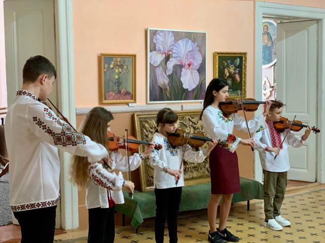 Виставку відвідали учні ОЗО Кіцманський ліцей #1 та керівництво нашої громади. Для них прозвучали музичні композиції у виконанні ансамблю скрипалів «Чарівні струни» під керівництвом Любові Стефлюк.