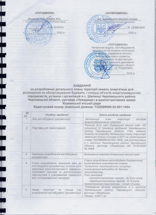 Підстава для розроблення - рішення XLIV сесії (II пленарне засідання) Кіцманської міської ради VIII скликання від 15.09.2025 року № 356/9 «Про надання дозволу на розробку детального плану території земельної ділянки площею 0,9317 га (кадастровий номер 7322589000:02:001:1454). яка розташована в с. Шипинці Чернівецького району Чернівецької області, урочище «Левадище».