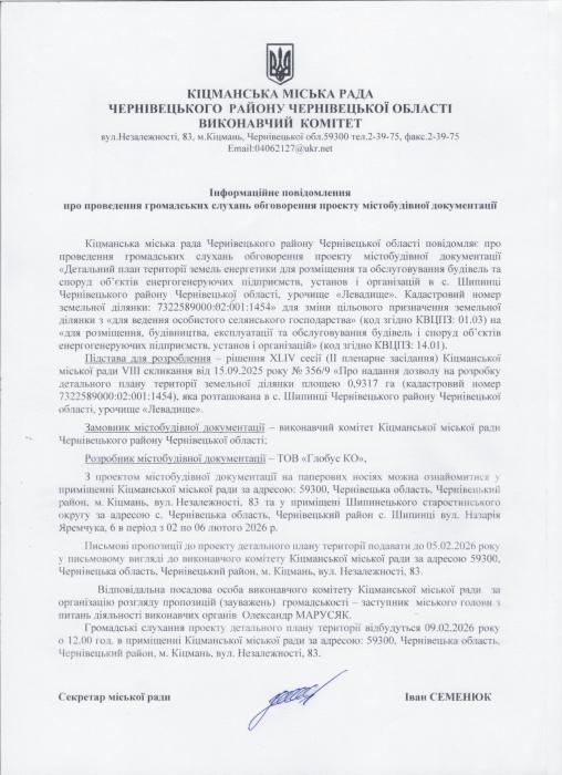 Громадські слухання проекту детального плану території відбудуться 09.02.2026 року о 12.00 год. в приміщенні Кіцманської міської ради за адресою: 59300. Чернівецька область. Чернівецький район, м. Кіцмань. вул. Незалежності. 83